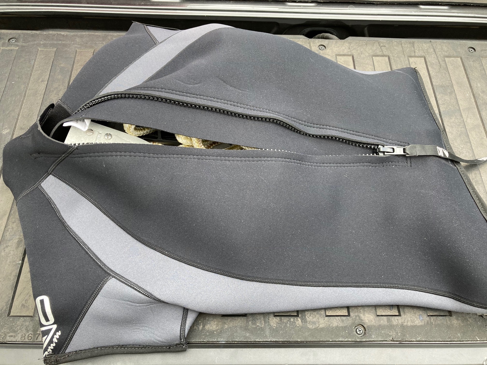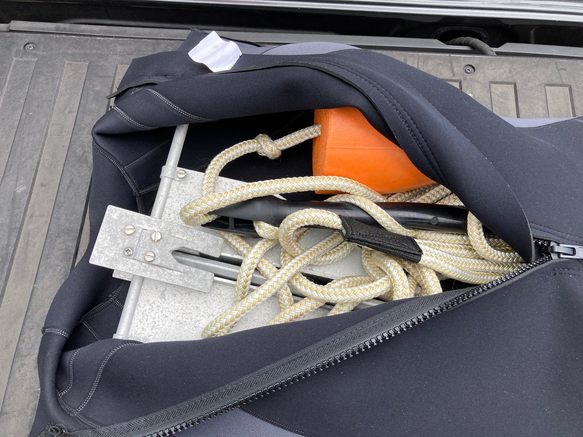 Awhile back someone on another forum posted about a bag to store a skiff anchor. It was padded and formed to fit, but $125. I wasn't happy with the towel or shower mat I had been using to stow my own (Guardian aluminum with stainless chain, snubber, float and short rode). I don't use it often so didn't want to shell out that much for a bag. Someone mentioned neoprene in the post, so I searched on eBay and found several gently-used shorty dive suits that were very reasonable. Bought one from a seller here in Florida for $20 and just took it to Covertime Upholstery to have it modified.