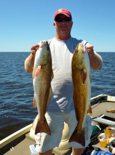 Decided to take the day off and go fishing for a change (I can believe in). Haven't done so since August of last year. Called up my buddy Raymond and we hit the Ecky around 7am Friday morning. 1st boat there :wink: Ran out the mouth and east towards Rock Island. Stopped in 2 ft. and started throwing topwater. Just short blowups, but no hook ups. Switched to suspending twitchbaits, and it was on! Trout after trout. Then reds.....BIG ones. By 9am, we had 4 nice reds in the live well along with 10 trout :o Decided to check my phone and saw where BBG was trying to get ahold of me. I got through to him and told him to come where the fish were. Luckily, he found us and was able to get a shot of a few reds.....I forgot my camera due to being rusty from such a long time off :roll: