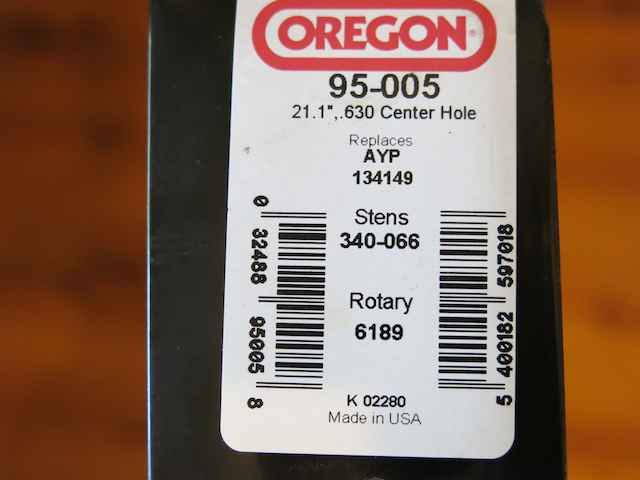 Bought these for the old mower and never installed them. They are brand new Oregon (Made in the USA!) lawn mower blades with the star mounting holes. Label says 95-005, Replaces AYP 134149, Rotary 6189. They are the same as was on my Craftsman riding mower, but I believe they are a fairly standard size blade.