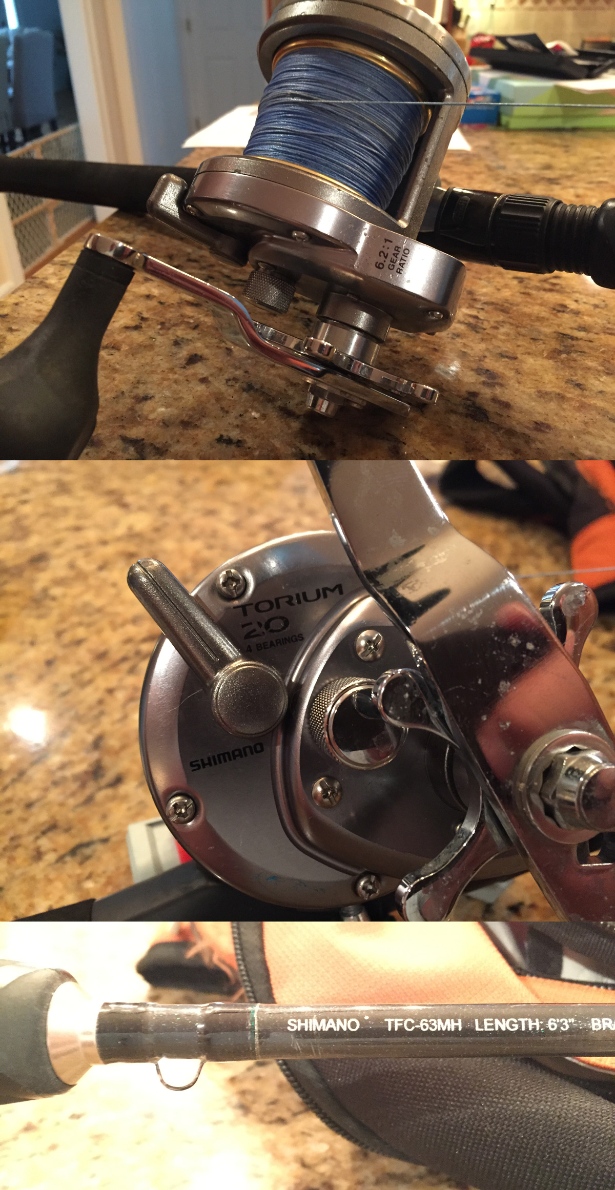 Older ( 5 years old) Shimano Torium 20. Spooled with 50lb Momoi Blue Diamond Braid.