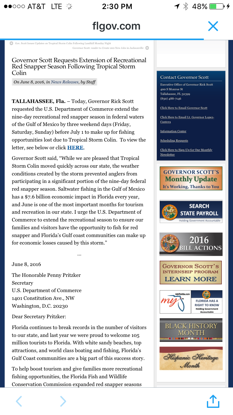 For our friends up in Georgia, etc a call down to the Governor's Office indicating that you all would come on down this weekend to fish for snapper if the season is extended would be helpful.