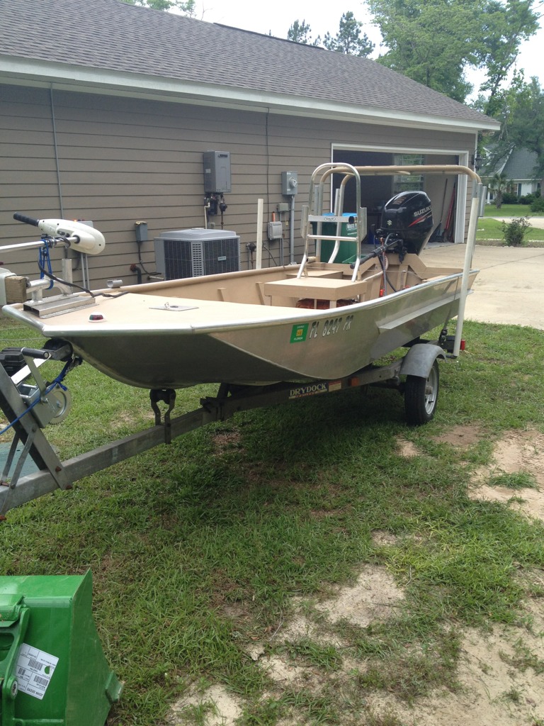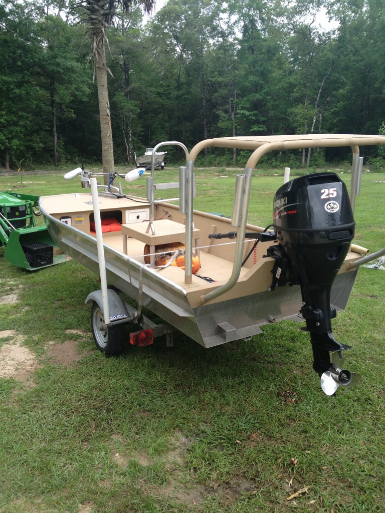 All welded, removeable center seat, bed lined inside, wired lights and bilge. Boat is a 2014- 25hp 4stroke is 2012. Trailer has newer bearings, tire and wheels, Asking 5000.00!!!-Thanks for looking, Matt.