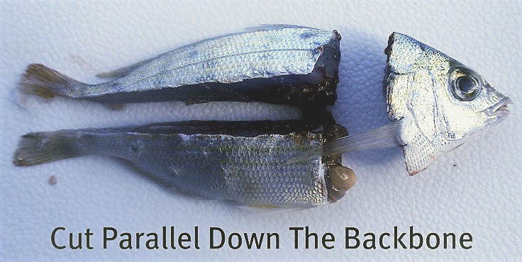 Cut the head off behind the pectoral fins, leaving the bulk of the body and tail. Cut lengthwise in half so you have two sections/baits with a chunk of the body and half tail. You'll have a top and bottom half. In other words, split what remains of the pinner in half for two baits. The exposed meat will give off scent and the tail section adds to the profile. Does that make sense?