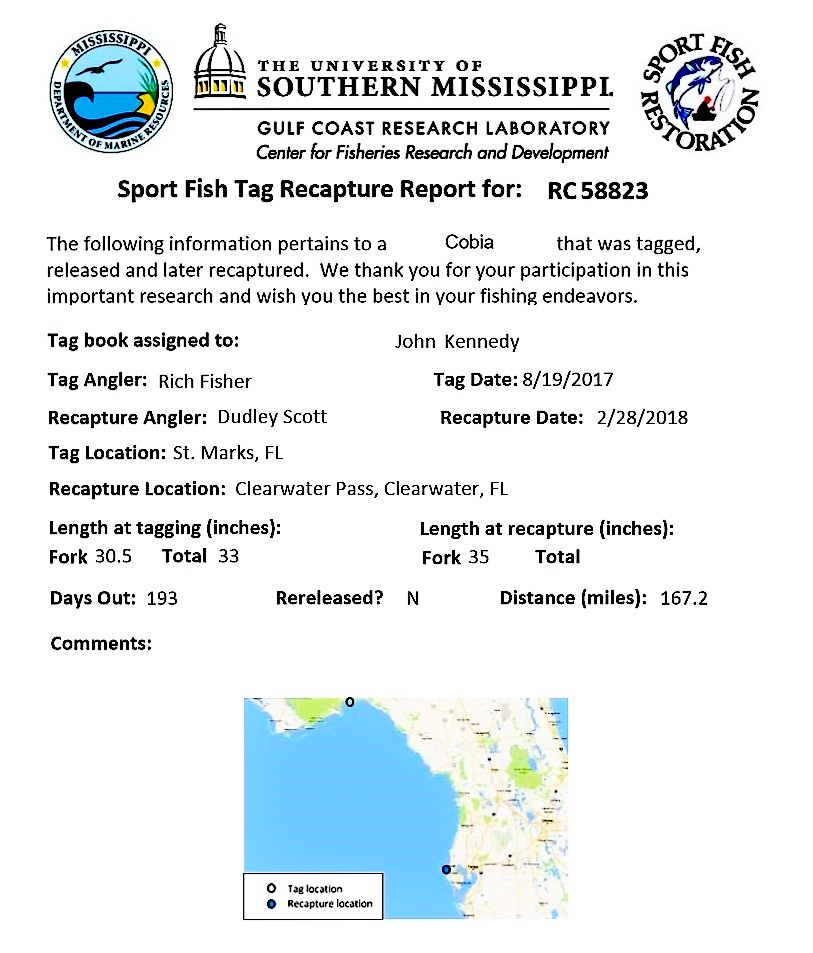 Just got my 3rd recapture report -- and that's out of 70+ cobia tagged aboard Marine's Dream to date. Not quite the distance of the one you shared, Silverking, but is the greatest travel of the 3 return hits I've got.