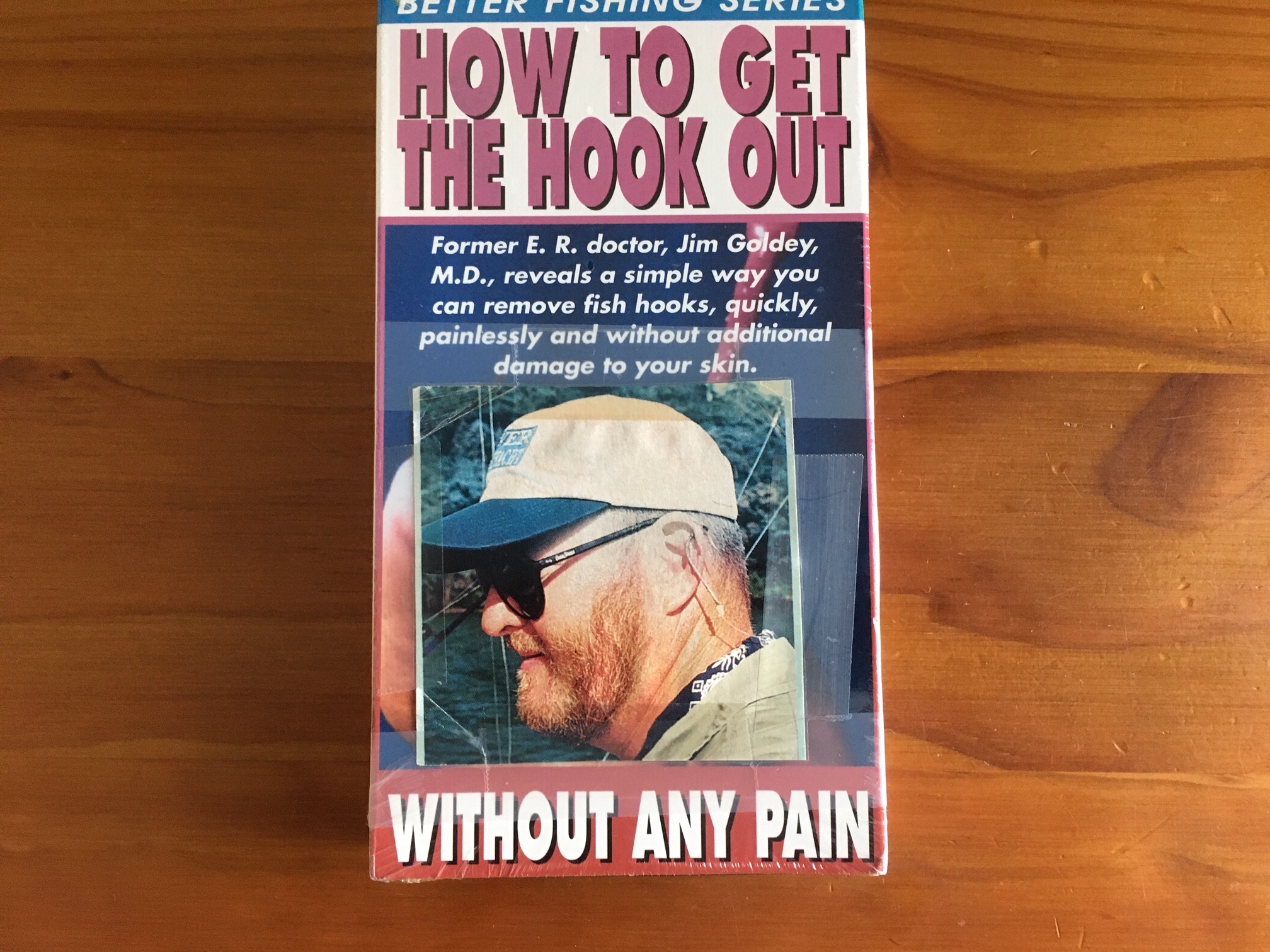 Different close encounter, this time 20 years ago at Tropic Star Lodge in Panama. Leader popped loose on big-game rod in overhead rack. I twitched and drove this 7/0 marlin hook through the cartilage of my left ear. I was fishing with Guy Harvey at the time. When we docked, Guy shot this photo before the manager used bolt cutters to cut the shank and back the hook out. Swabbed with iodine and washed down a couple Tylenol with a cold Polar cerveza chaser. An editor/comedian at Power & Motoryacht later taped the pix to the cover of this VHS tape on hook removing and sent it to me.