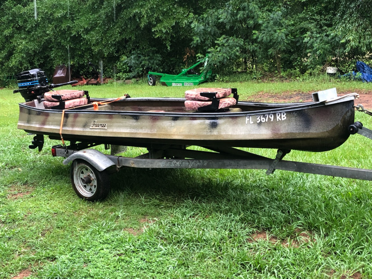 13’ Gheenoe for sale. This is a clean boat, no patches or repairs. I put an extra coat of epoxy on the bottom just because I had it. Removable carpeted sub flooring. Trailer is in great shape and a 7.5 Mercury that could use a little paint but runs great. $1200