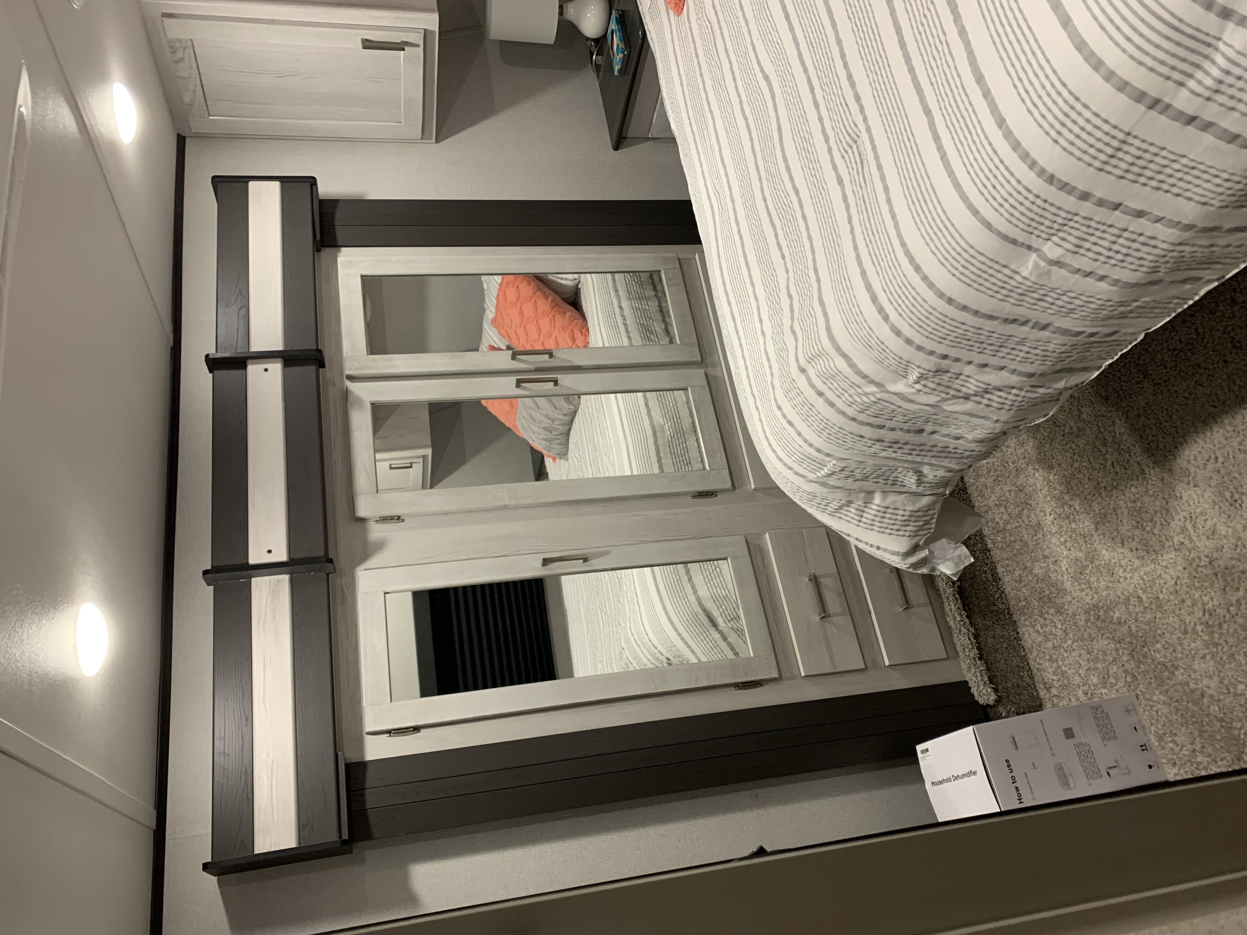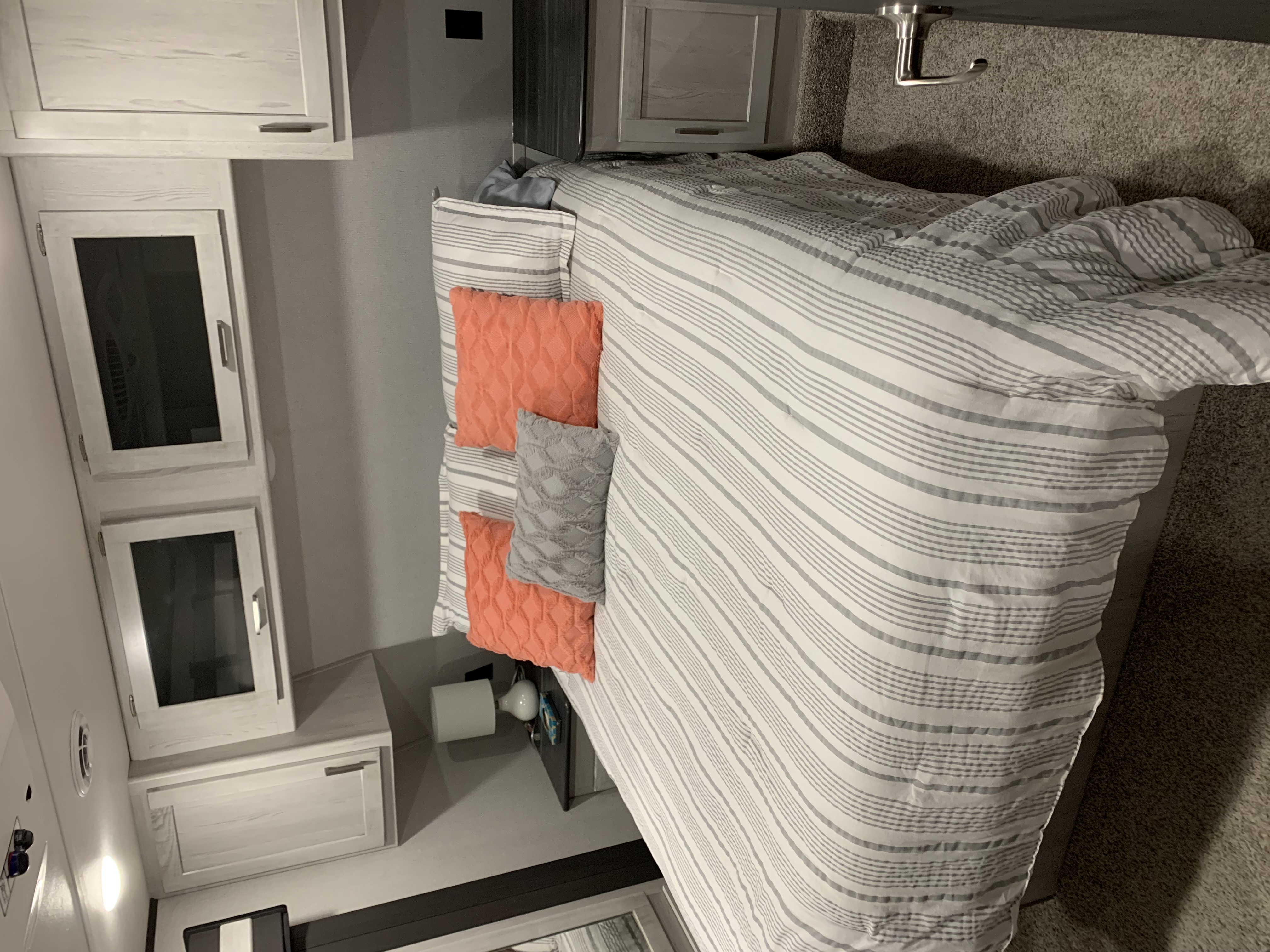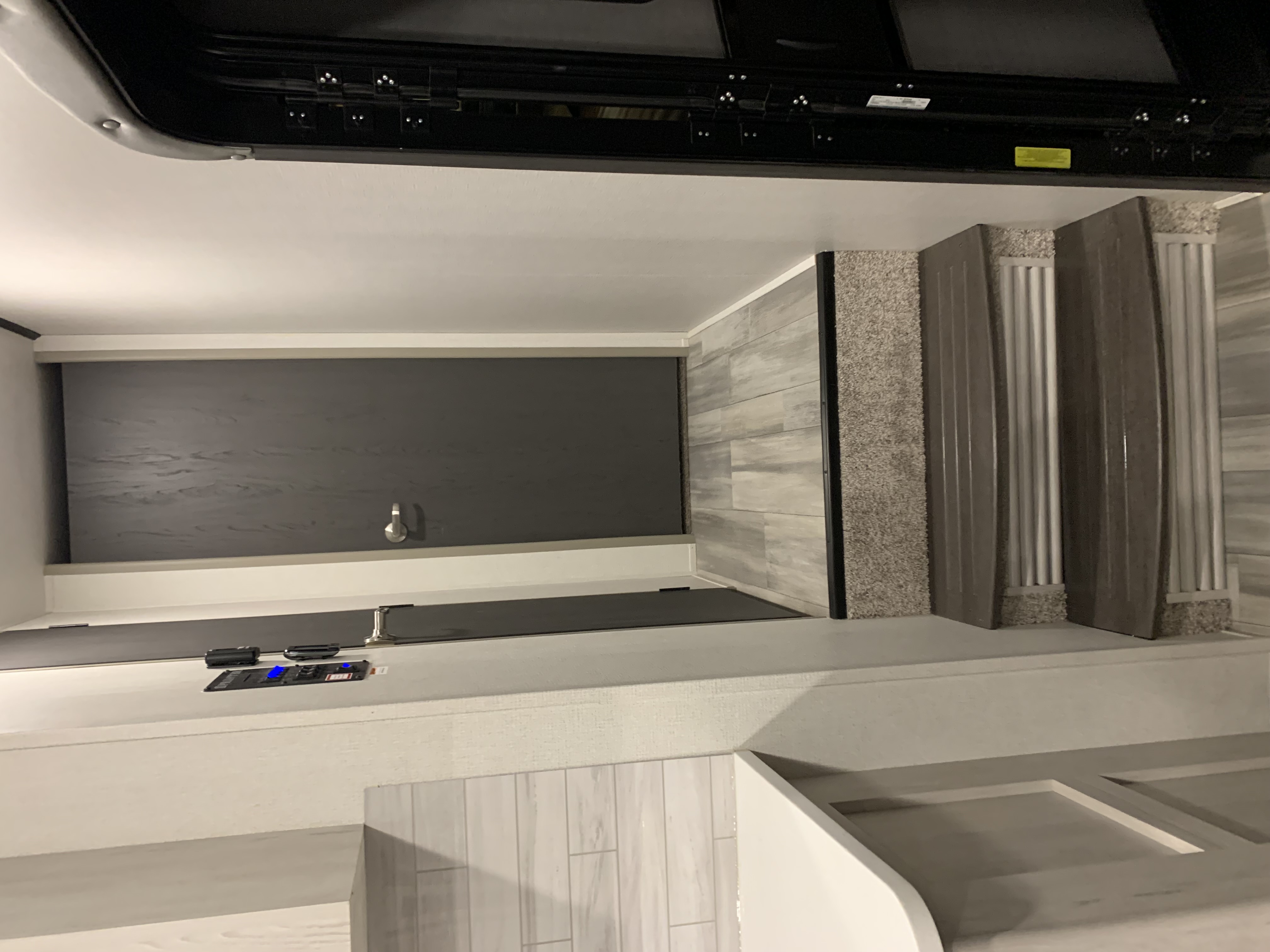 It was pulled from there to our home in Georgetown, GA. and from there to Carrabelle where it stayed for the months of October and November 2021. We stayed in it for maybe 6 nights and days while it was there. We pulled it home at the end of November and it's been in storage since then. I have attached a PDF of a floorplan and description for a 2022 model just to show what the floorplan is and what the standard and options are. Ours has all of the same things. The only things that I know are wrong with it are: back right leveling jack is bent. It didn't hamper us using it but it is bent. On the bumper in the back, the right side end cap is missing. The shower track is on backwards. We installed a shower curtain to use to keep water from coming out of the shower. There is also a recall on it and we are in the process of taking it back to Ashley to get that done. We will have the shower track repaired at that time.