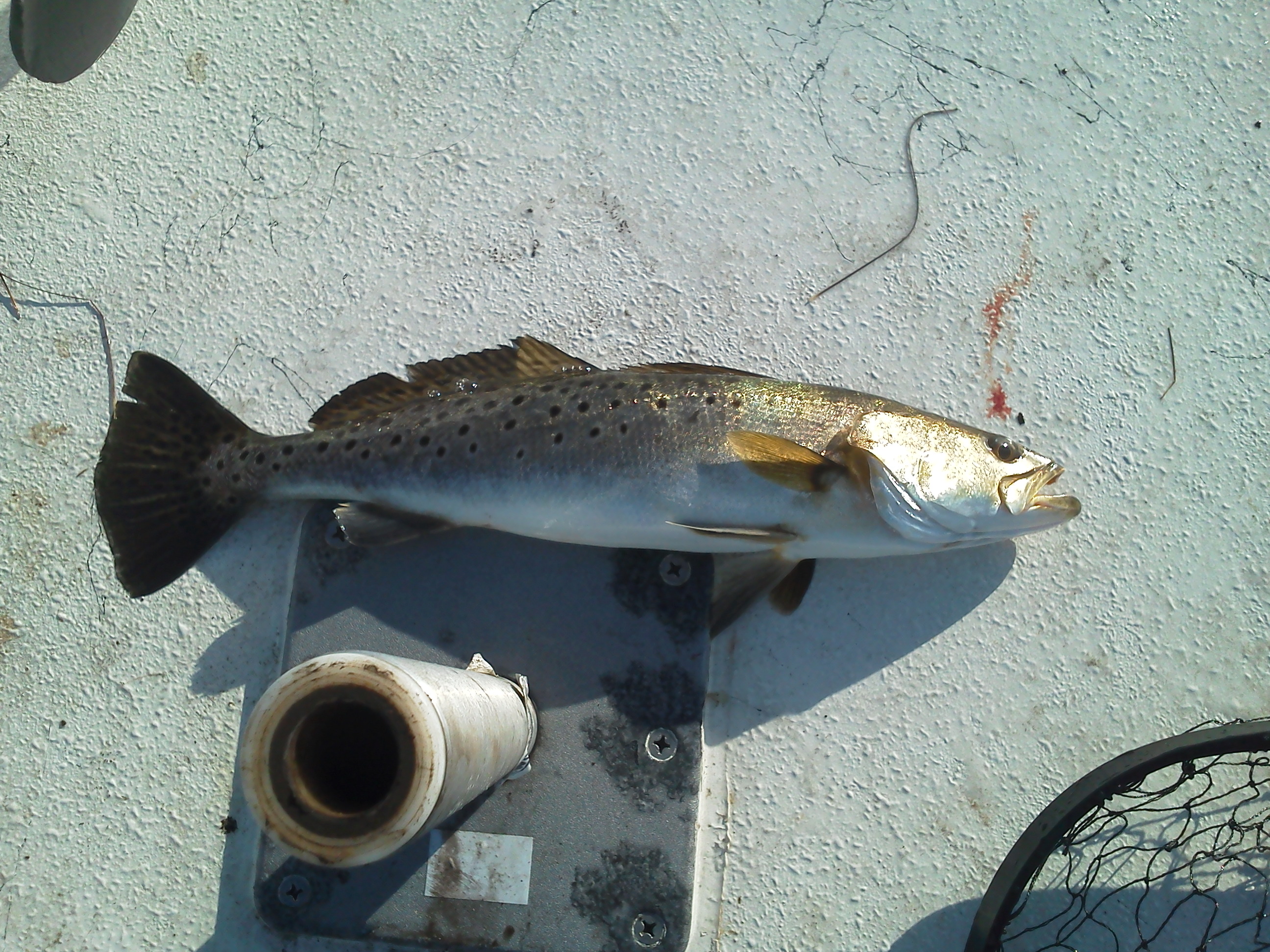 I started to head in and stopped about 1/2 mile outside of Stoney Bayou and tried a jig/cork ( first time of the day). An 18" trout went into the box.