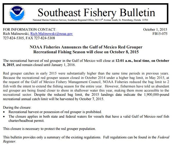 Re: FYI Red Grouper closing