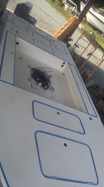 all holes from the t top, poling platform, trolling motor, and push pole holders filled in and glassed