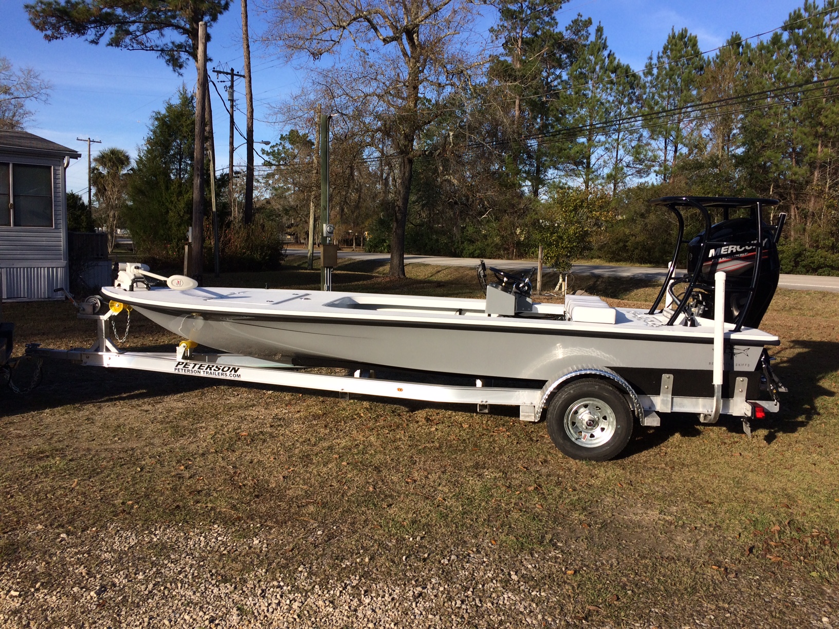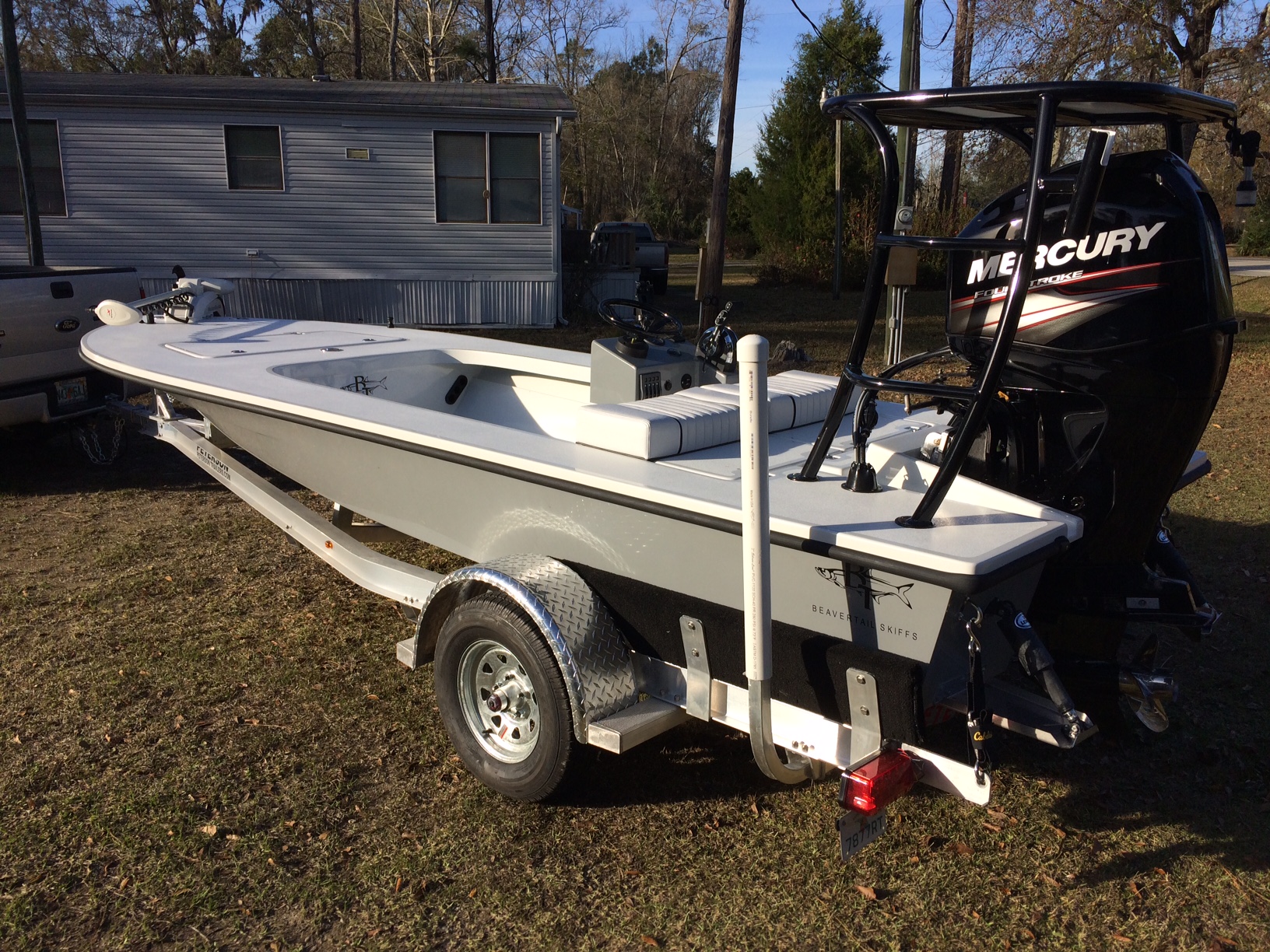 After a 12-hour day and nearly 600 miles, my new Beavertail Mosquito skiff is safely tucked into her new apartment. As with my previous experience, Will and Liz, the husband/wife owners of the company, were an absolute pleasure to work with. They accommodated my special requests, went above and beyond in service and produced a very sexy skiff that I promised my wife will be the last boat I own. Will made 37 mph on the check ride and I'm sure it'll nudge 40 after the break-in. Expect to be able to float in less than 6 inches of water with my normal load. Still some prep to do (wax, clear coat the trailer, add some trailer upgrades, load GPS numbers, etc.), but I can't wait to get her wet and slimy. If it performs like the center console I tested in December, I'm going to be a very happy owner!