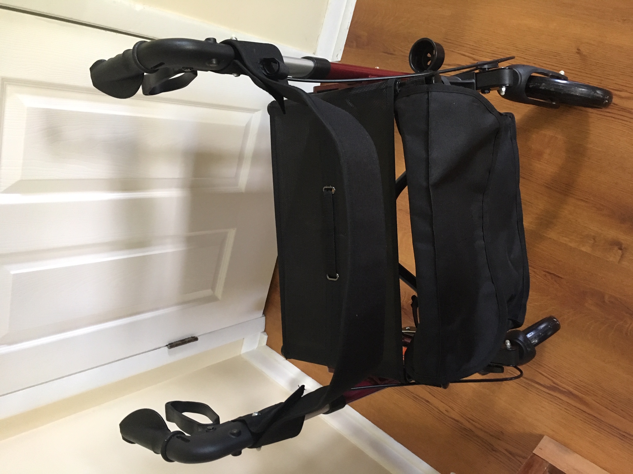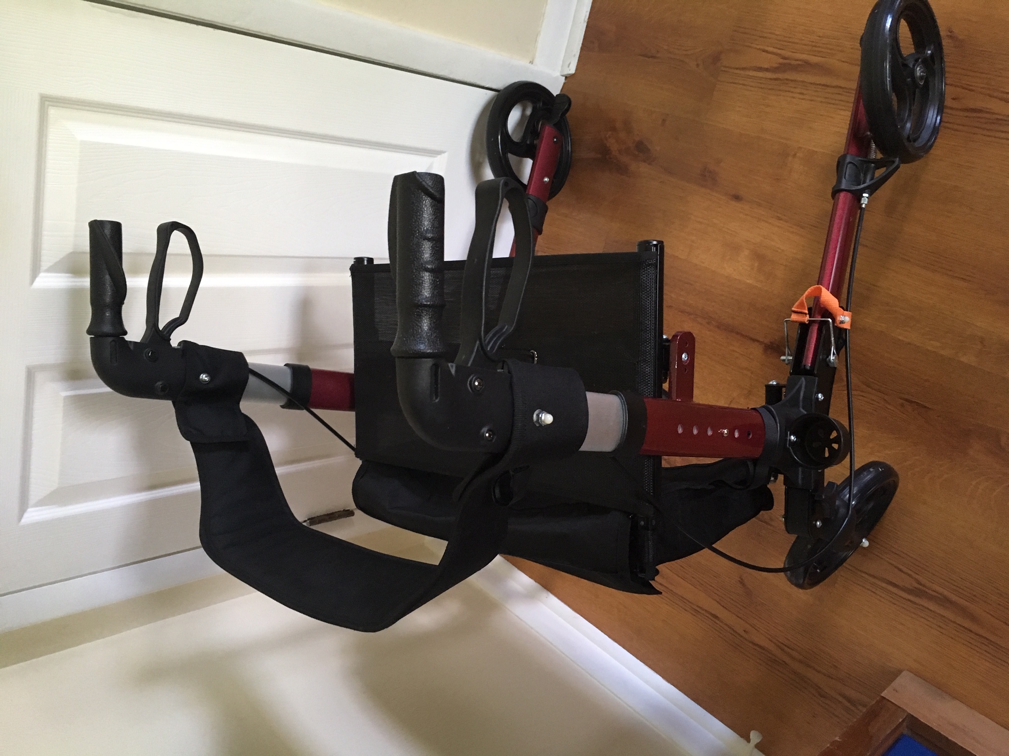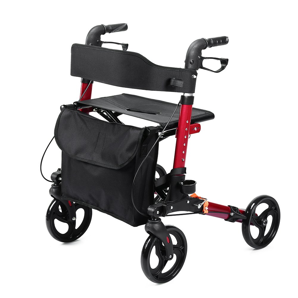 Elenker Medical Rollator/Walker. With 8-inch rotating front wheels, sturdy mesh seat, locking brake system, cane cradle, adjustable guide arms. Rolls easily over any surface, including carpet. Collapses for easy transportation or storage.