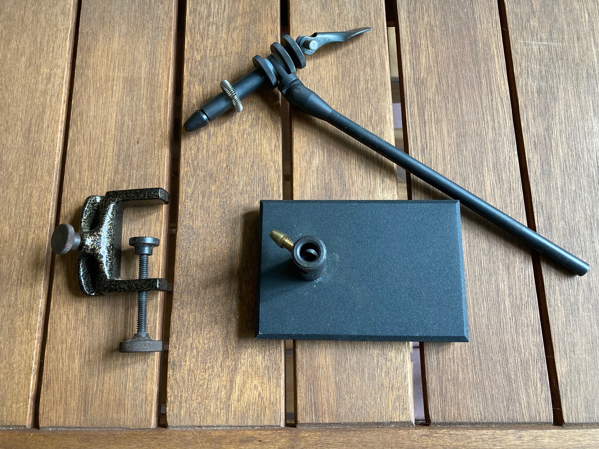 Just re-discovered this in a box in my closet. It's the classic Thompson Model A vice with heavy pedestal base as well as travel clamp. All parts included. It does have a little corrosion from age. Clamp head rotates. Not fancy but quality workmanship that's very functional.