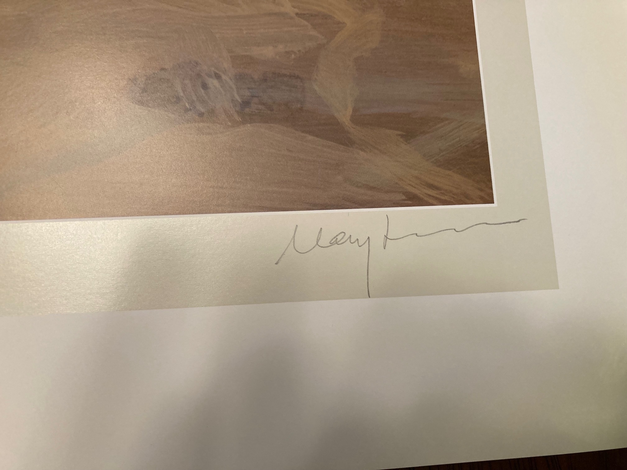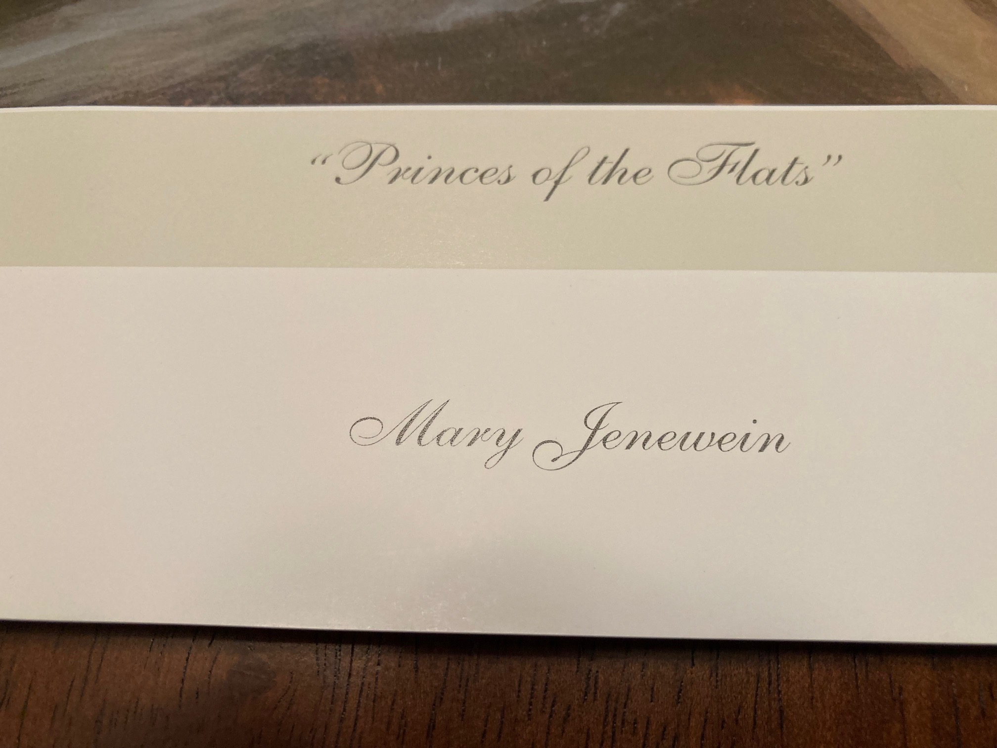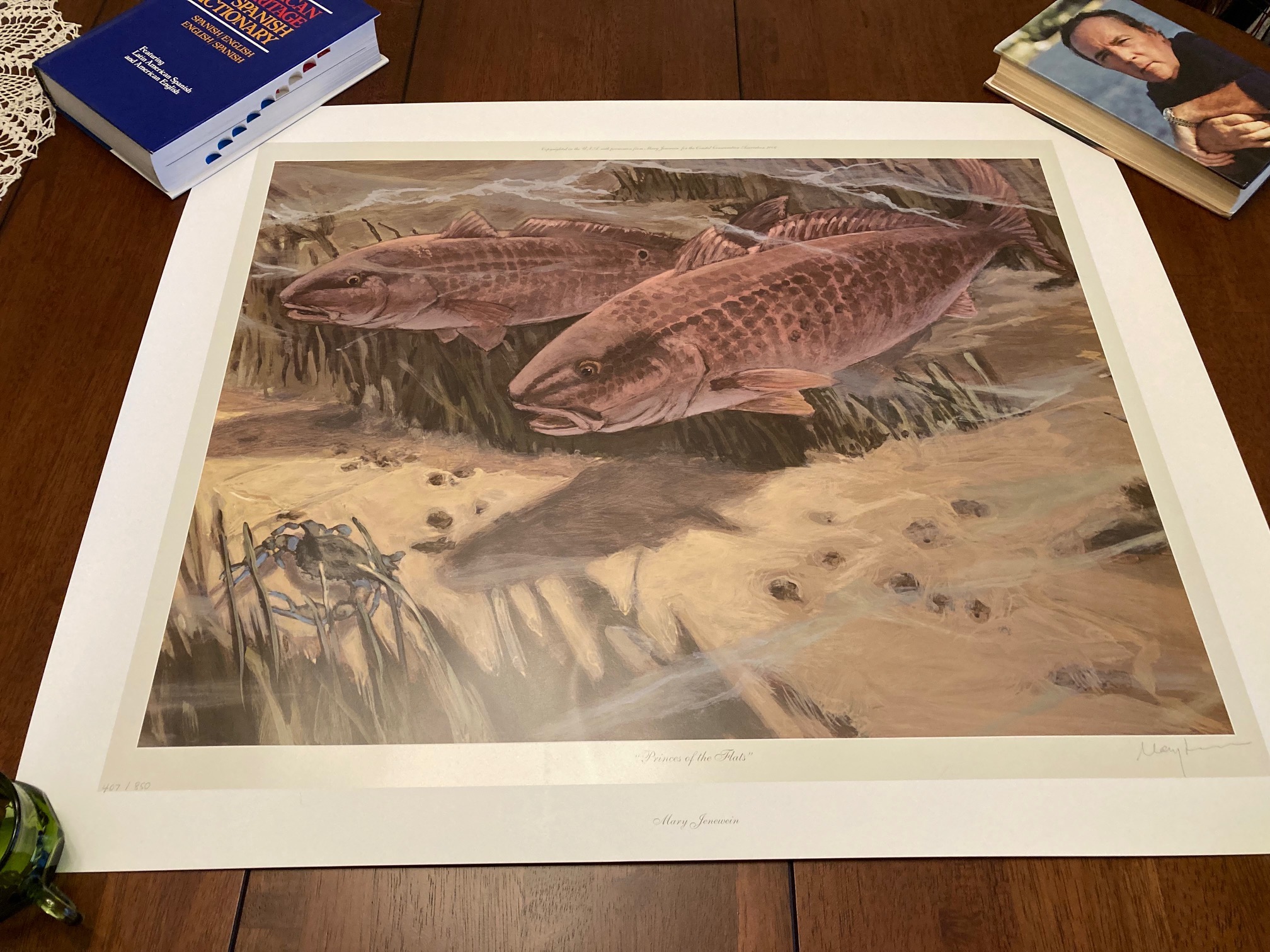 Print #407 of 850 by well-known Houston artist Mary Jenewein, this signed copy of Princes of the Flats depicts two cruising redfish approaching a blue crab in the shallows. This was a CCA banquet item and is signed in pencil by the artist. Never framed or matted.